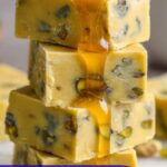 Once the fudge has fully set, keep it in the pan and run a sharp knife through to cut into 36 equal squares. It’s now ready to share or savor little by little whenever a pistachio craving strikes.