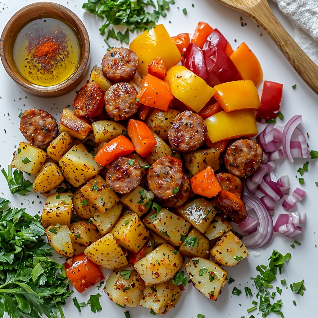 Spread the mixture evenly on your prepared baking sheet in a single layer to ensure even roasting. Bake for 20 minutes, then remove the pan to stir everything gently to promote even browning. Return it to the oven and bake for another 15-25 minutes until the potatoes are tender and golden, and the sausage and vegetables develop a beautiful caramelized finish.