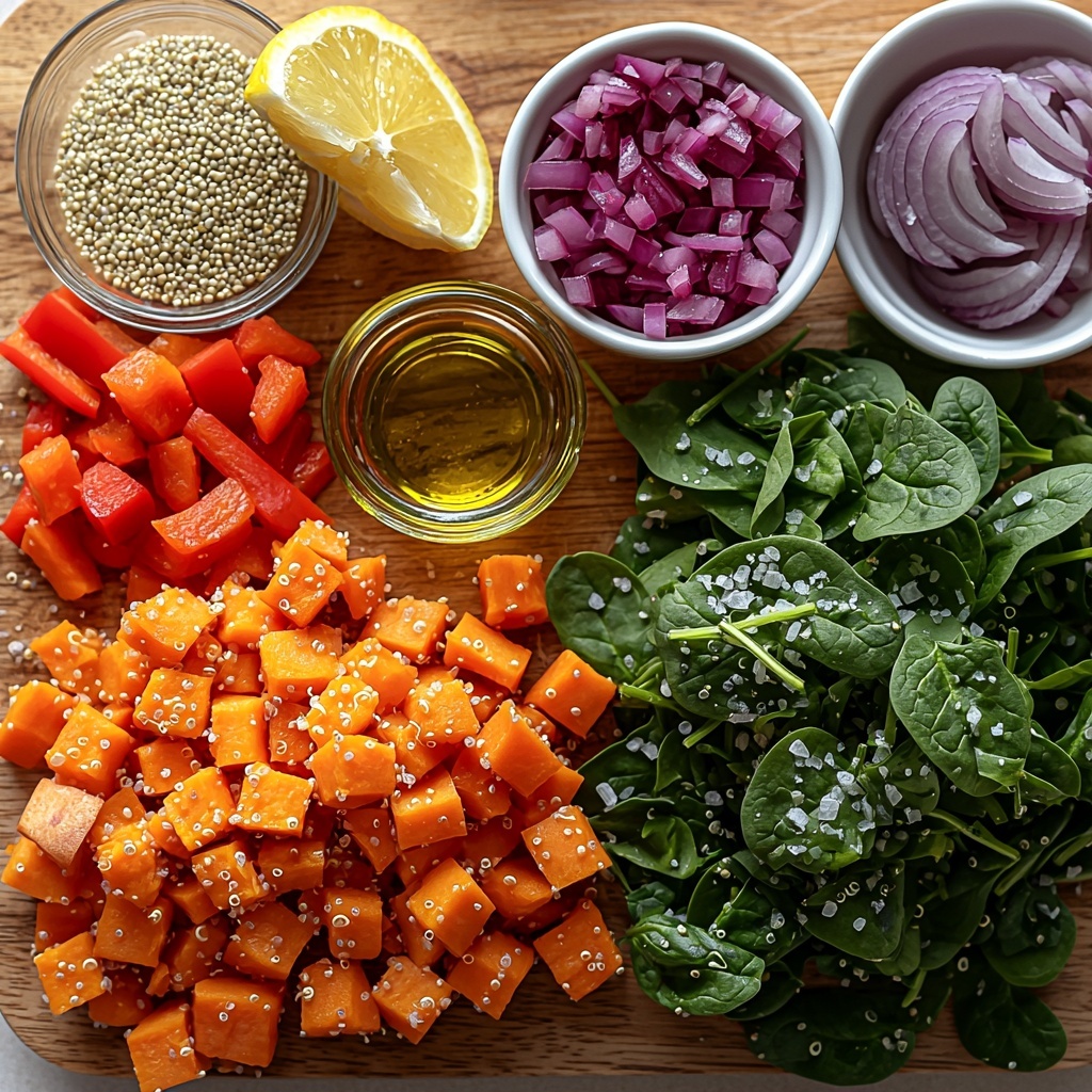 In a large bowl, combine the chopped fresh spinach, diced red bell pepper, and finely chopped red onion. These ingredients inject a lively crunch and freshness that balance the richness of the roasted sweet potatoes and quinoa.