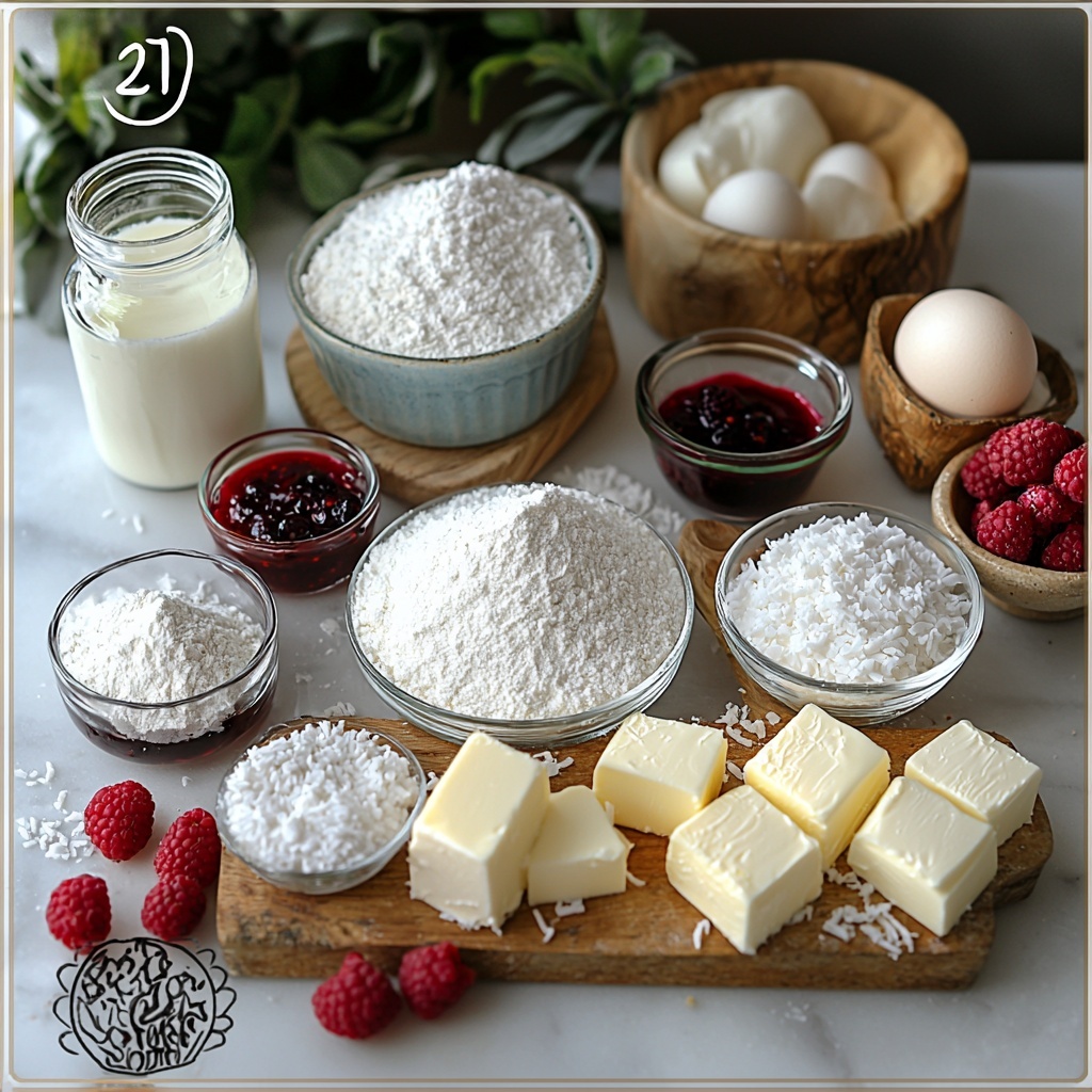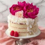 This Raspberry Coconut Snowball Cake is a luscious and moist layered cake bursting with tropical coconut flavor and a vibrant raspberry surprise. Featuring a tender crumb infused with coconut milk, shredded coconut, and extracts, it is layered and frosted with a creamy coconut cream cheese frosting and finished with raspberry preserves and more shredded coconut for added texture and burst of fruity sweetness.