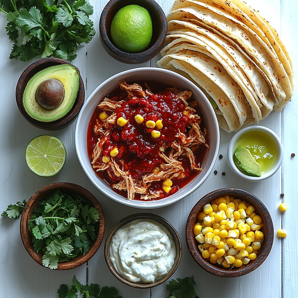 These ingredients are refreshingly straightforward yet essential for capturing the heart of authentic Red Chile Chicken Tacos with Corn Crema Recipe. Each element brings its own character—whether it’s the smoky depth of the red chile sauce or the luscious creaminess of the corn crema—and together, they create a deliciously balanced taco experience.