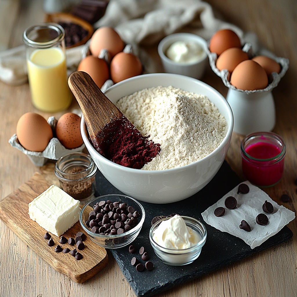 These ingredients are wonderfully simple yet crucial in delivering that perfect balance of texture, flavor, and vibrant color in your cake. From rich cocoa powder to tangy buttermilk and the essential red food gel dye, each plays a vital part in creating this memorable dessert.