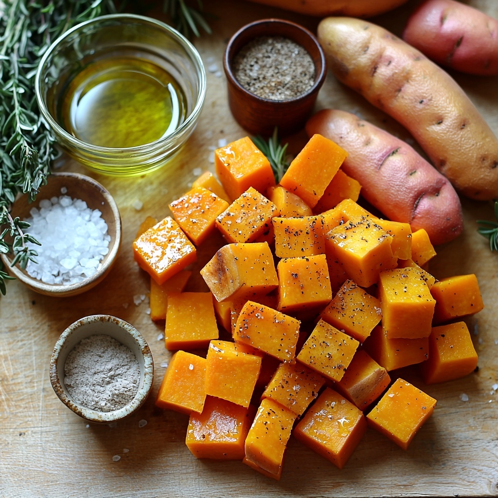 In a big bowl, combine the cubed butternut squash and sweet potatoes. Drizzle olive oil over the top, then sprinkle salt, pepper, garlic powder, and cinnamon if you’re using it. Add the fresh rosemary or thyme as well for that herbal boost. Toss everything gently but thoroughly so each cube is coated in this flavorful mixture—this step is critical for achieving that golden, caramelized finish.