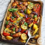 This Sheet Pan Lemon Herb Chicken recipe is a quick and flavorful dish perfect for a healthy weeknight dinner. Juicy boneless, skinless chicken thighs are marinated in fresh lemon juice, garlic, oregano, and olive oil, then roasted alongside vibrant mixed vegetables like bell peppers and zucchini. The entire meal cooks together on a single sheet pan, making cleanup easy and keeping the flavors fresh and bright. With only 40 minutes total, this wholesome Mediterranean-inspired meal is both satisfying and nutritious.