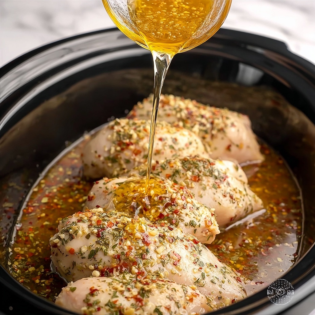Start by placing your chicken breasts in an even layer at the bottom of your slow cooker. If some breasts are extra thick, slice them horizontally to create an even thickness. This little step makes sure every piece cooks evenly and stays juicy.