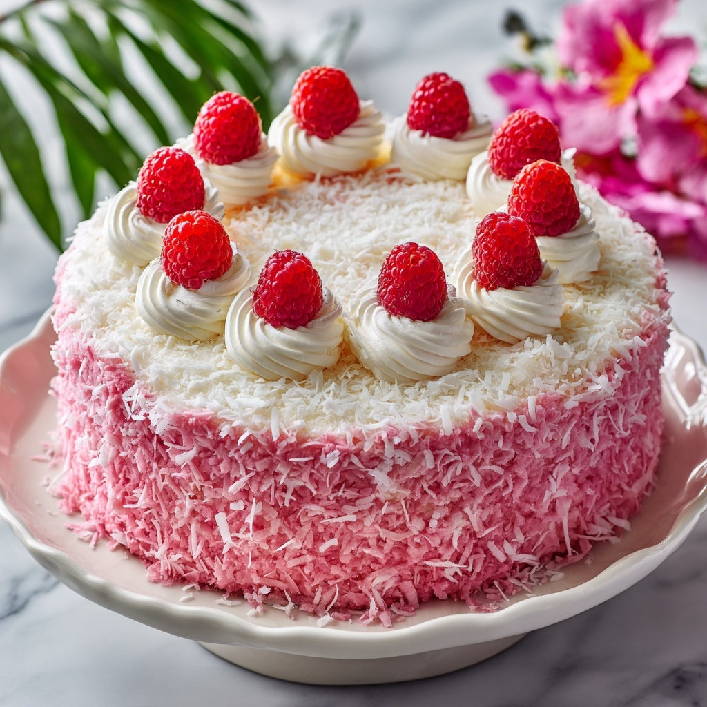 - Serve: Slice the cake into 10–12 pieces and serve to enjoy the delicious raspberry coconut flavors.