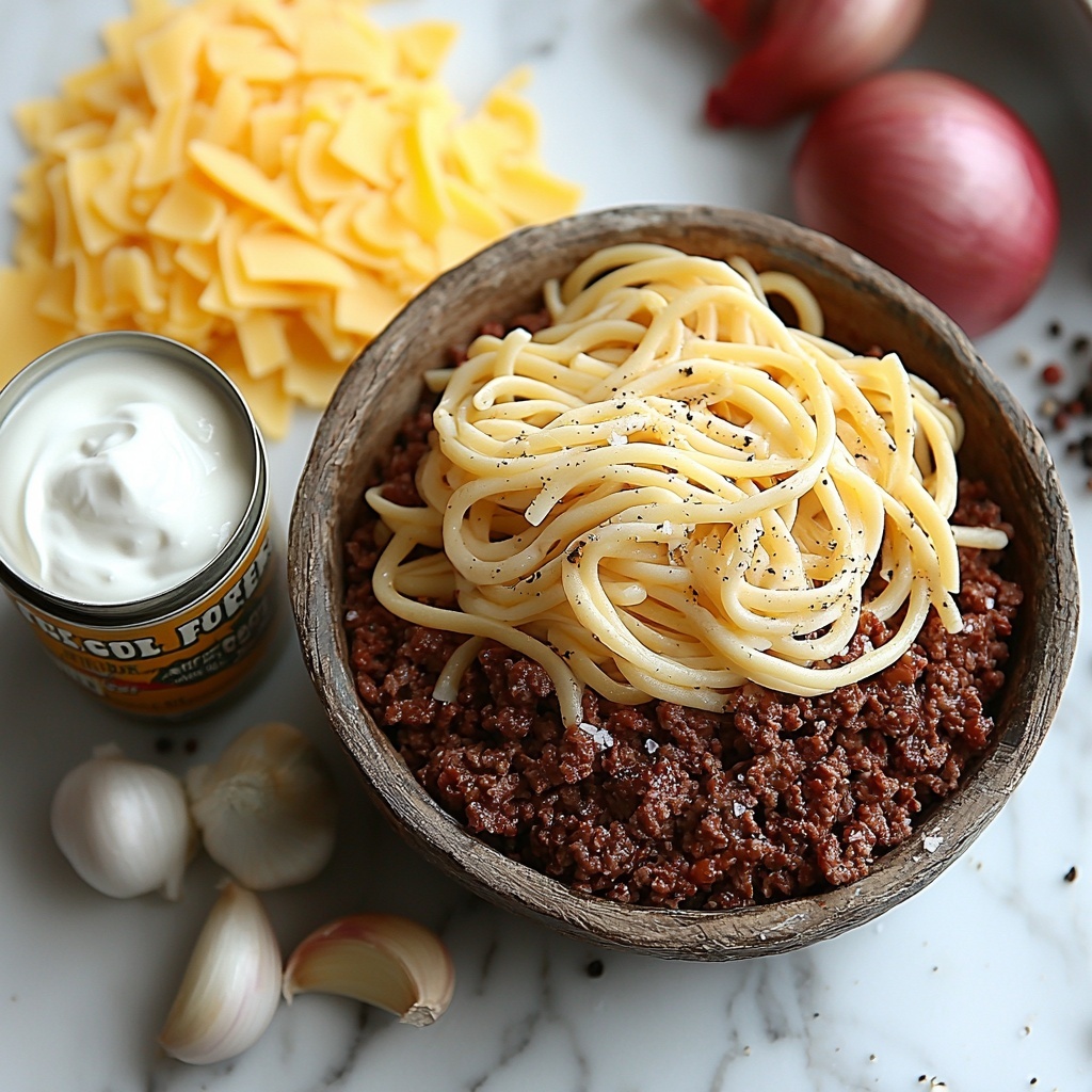 This Sour Cream Beef Noodle Casserole combines tender ground beef, creamy sour cream, and hearty egg noodles into a comforting baked dish topped with bubbly melted cheese. Perfect for cozy family dinners, this casserole blends savory flavors and creamy textures in an easy-to-make meal ready in under an hour.
