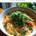 Spicy Coconut Noodles is a flavorful and creamy dish combining tender rice noodles with a rich coconut milk and red curry paste sauce, complemented by fresh bell peppers and spinach. This quick and easy recipe is perfect for a satisfying weeknight meal, garnished with fragrant cilantro for an added burst of freshness.