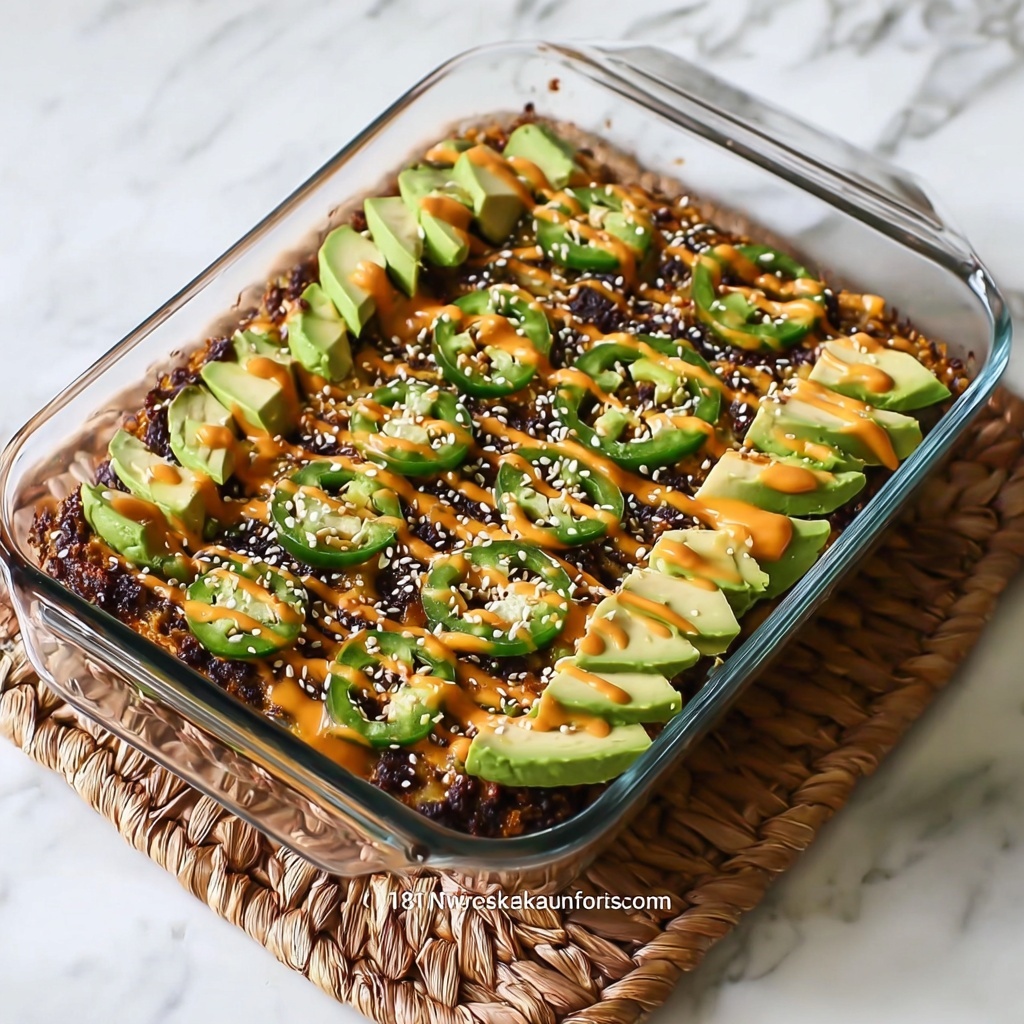 To top off your sushi bake, sprinkle toasted sesame seeds and chopped scallions all over for vibrancy and crunch. Add sliced jalapeños for extra heat and slices of creamy avocado for a silky contrast that balances the spice beautifully. These garnishes not only add flavor and texture but transform the dish into a feast for the eyes.