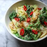 This Spicy Stir-Fried Cabbage is a quick, crunchy, and flavorful side dish perfect for adding a vibrant kick to any meal. It features thinly sliced green cabbage stir-fried with garlic, fresh ginger, red chilies, and a savory blend of soy sauce, rice vinegar, and sesame oil, garnished with green onions and toasted sesame seeds. Ready in just 25 minutes, it’s an easy and nutritious addition to your weeknight dinners.