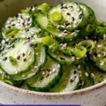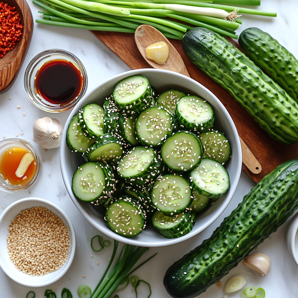 Finally, sprinkle toasted sesame seeds and thinly sliced green onions over the top as garnishes. Let your Spiral Korean Cucumber Salad Recipe marinate for at least 10 minutes before serving—this step really lets all those vibrant flavors meld together for maximum deliciousness.