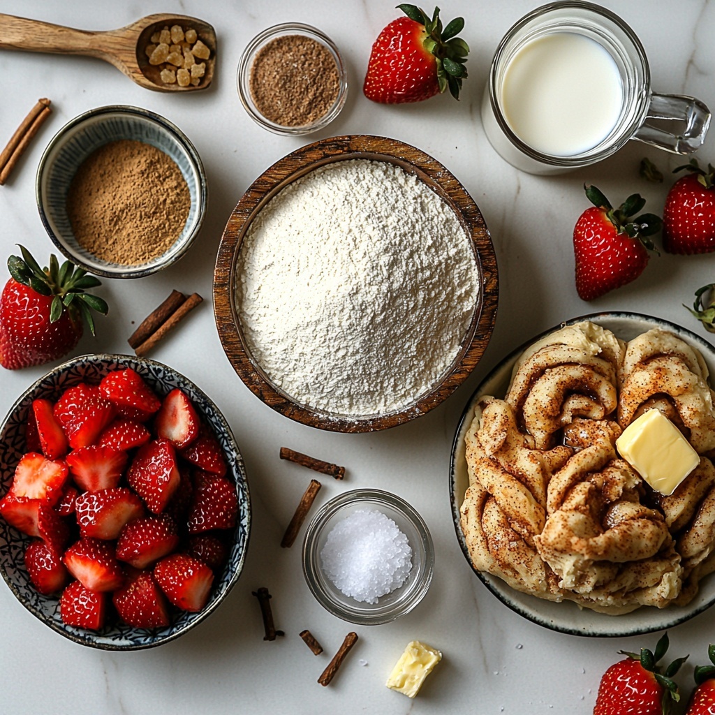 These ingredients are simple pantry staples with a fresh pop of strawberry that turns classic cinnamon rolls into something truly special. Each item plays a crucial role in delivering the perfect balance of texture, flavor, and that irresistible aroma that fills your kitchen.