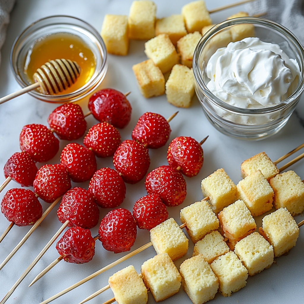 Gathering the ingredients for this recipe is refreshingly simple, which means less time shopping and more time enjoying! Each component plays its own crucial role: strawberries bring vibrant color and juicy freshness, pound cake offers a tender, buttery base, honey adds subtle natural sweetness, and whipped cream finishes it off with light, creamy indulgence. Together, they create a perfectly balanced dessert.