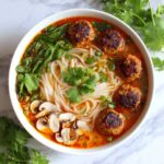 To truly complete your Thai-Style Chicken Meatball Noodle Soup Recipe, squeeze fresh lime juice over the bowl right before serving. This brightens the flavors and gives the broth a lively lift. Don’t forget to sprinkle a little extra chopped cilantro on top for that fresh herbal finish. Sit back, take a spoonful, and enjoy the perfect harmony of creamy, spicy, and fresh notes in every bite.