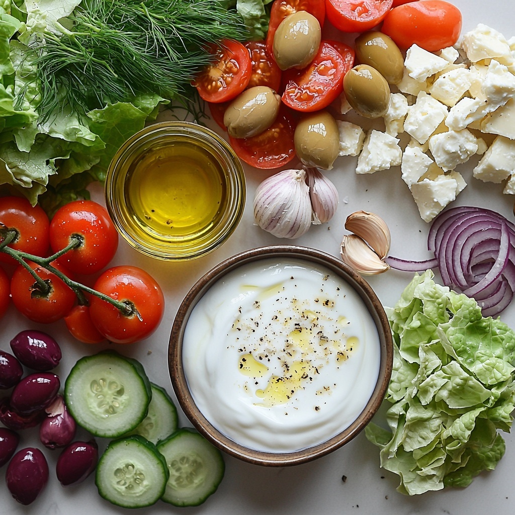 Getting the ingredients for this recipe is refreshingly simple, and each one plays a crucial role in building layers of taste, texture, and color that bring the salad to life. From the creamy Greek yogurt that forms the base of the tzatziki to the crunchy romaine and tangy feta, every bite bursts with Mediterranean charm.