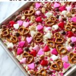 - Add Toppings: Immediately sprinkle the crushed pretzels, mini marshmallows, heart-shaped sprinkles, red and pink M&M’s, and optional chopped nuts evenly over the white chocolate layer. Press them gently to adhere well.