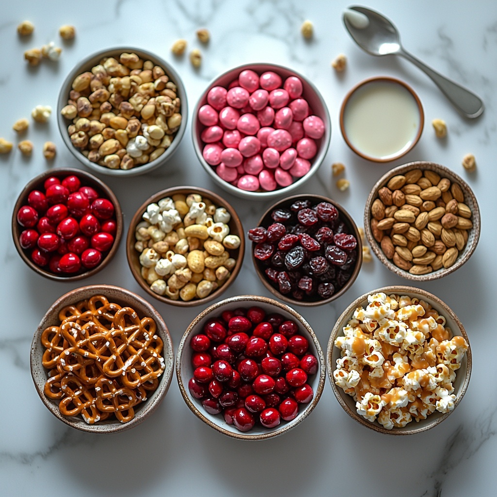 - Combine Snack Mix: In a large bowl, gently toss together the mini pretzels, chocolate-covered candies, caramel popcorn, mixed nuts, and dried cranberries until they are evenly mixed.