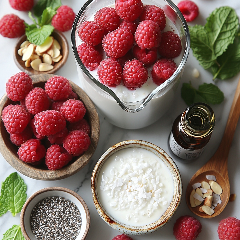 - Assemble and garnish: Before serving, give the pudding a quick stir. Top with reserved fresh raspberries, shredded coconut or sliced almonds if using, and a few mint leaves for color. Drizzle extra maple syrup on top if you prefer it sweeter.