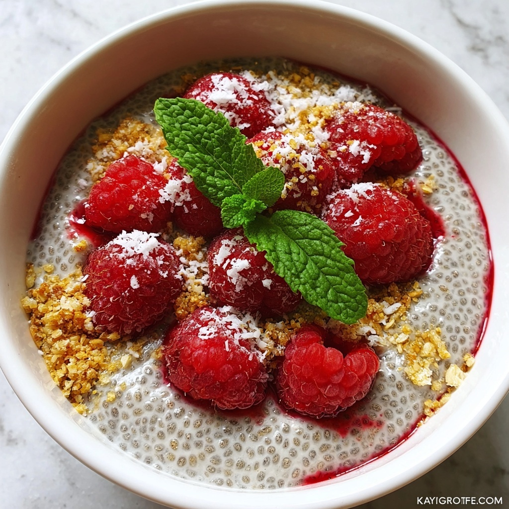 - Assemble and garnish: Before serving, give the pudding a quick stir. Top with reserved fresh raspberries, shredded coconut or sliced almonds if using, and a few mint leaves for color. Drizzle extra maple syrup on top if you prefer it sweeter.