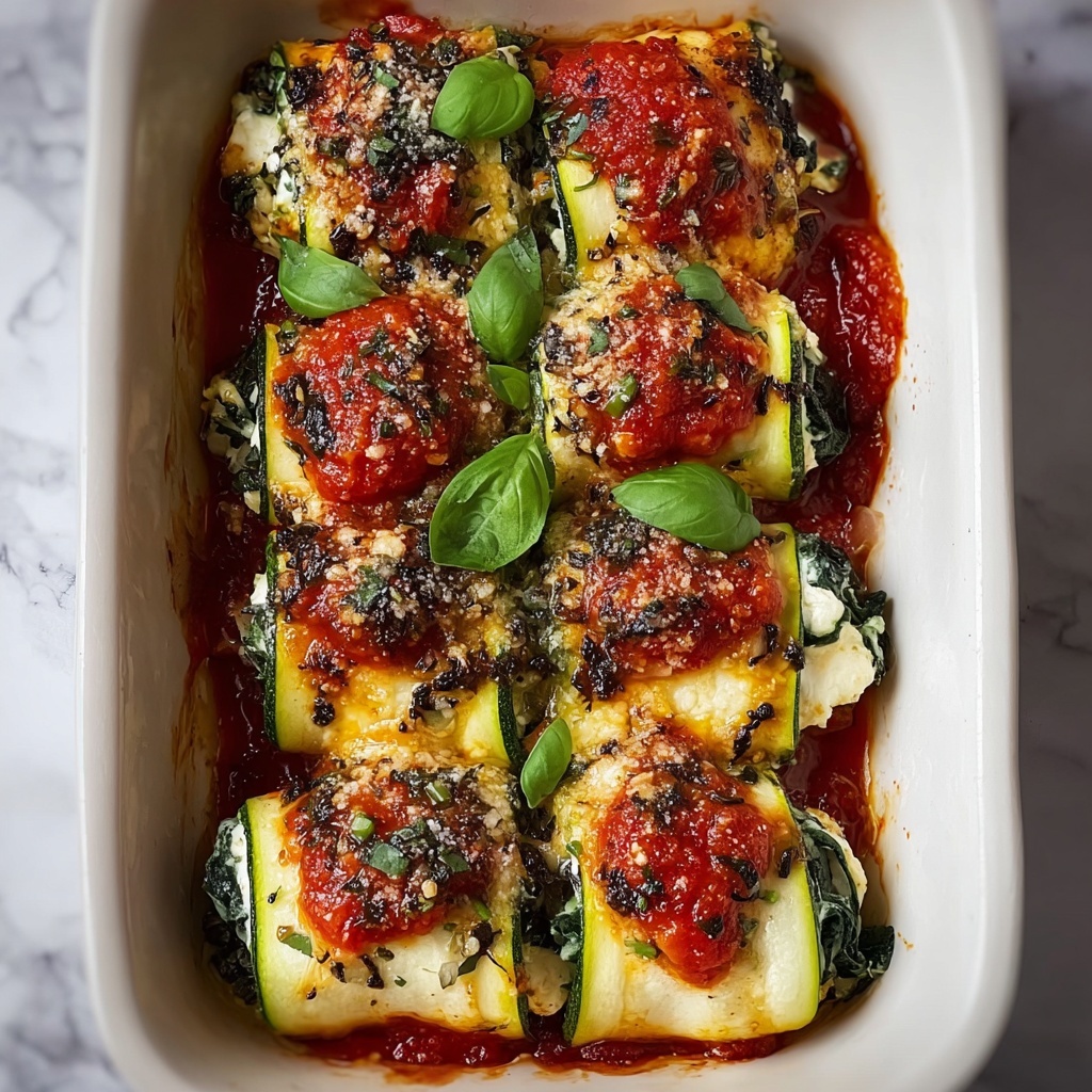 Lay each zucchini slice flat, spread a generous portion of the ricotta-spinach filling along the strip, then carefully roll it up. Arrange the rolls seam-side down in the baking dish, packing them close so they hold their shape during baking.
