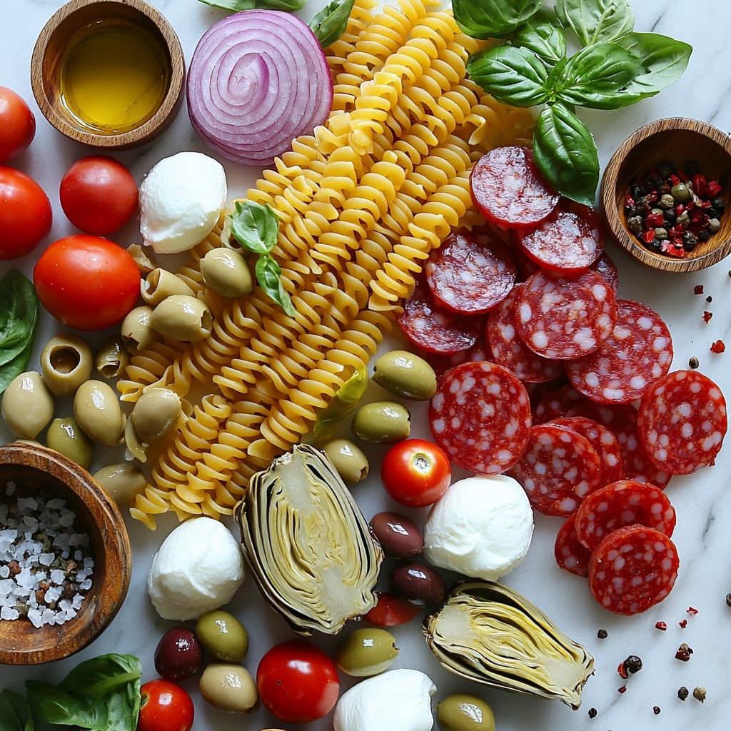 Time for the satisfying chopping and slicing! Dice the hard salami and pepperoni into bite-sized pieces, halve the juicy cherry tomatoes, thinly slice the red onion for a mild punch, quarter the artichoke hearts, halve the olives for easy eating, and roughly chop the fresh basil leaves to release their aromatic oils. This prep not only makes the salad easy to toss but also creates a beautiful palette of colors and textures.