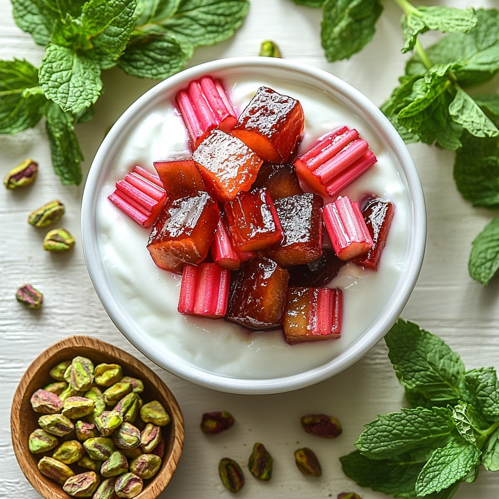 A simple and refreshing dessert combining creamy plain whole-milk Greek-style yogurt with sweet and tangy roasted rhubarb, topped with crunchy chopped pistachios and fresh mint leaves for a delightful texture and flavor contrast.